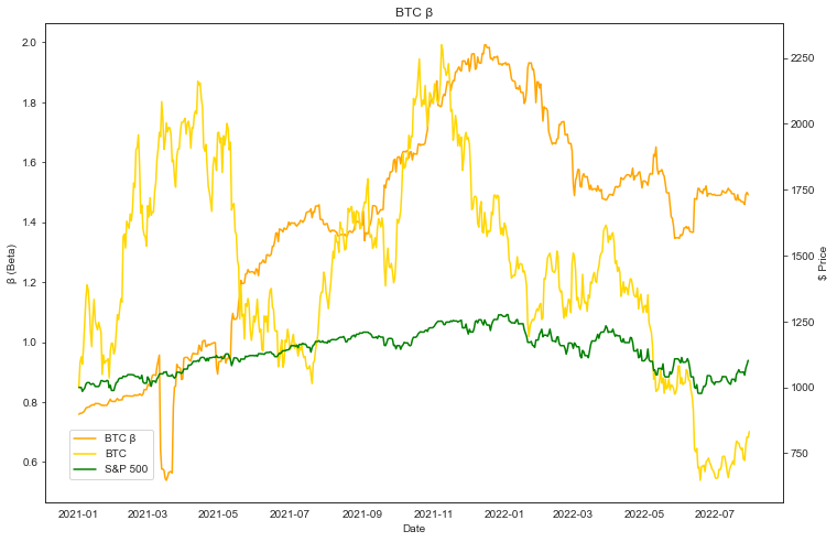12 month rolling beta of BTC vs. ES (S&P 500 futures) since January 1, 2021. Price is normalized to $1000