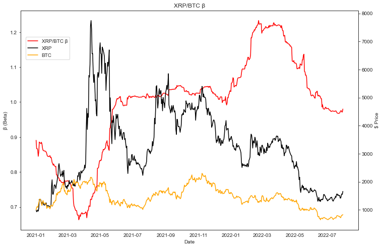 Slightly lower Beta! XRP is definitely less correlated to BTC than ETH. Does that mean it's less risky? Well Beta doesn't take into account pending FTC settlements, so we definitely only have part of the story. But it definitely does help inform our understanding of the risks of some of these investments while highlighting the fact that this risk measurement only takes into account price movements when something like XRP has many external factors guiding its price.